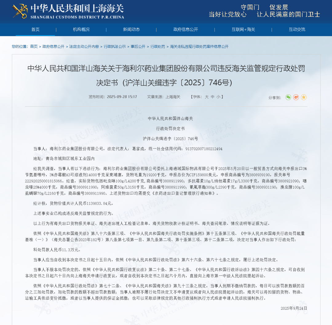 近日,中华人民共和国洋山海关发布关于海利尔(14.190, 0.00, 0.00%)药业集团股份有限公司违反海关监管规定行政处罚决定书(沪洋山关缉违字〔2025〕746号)。